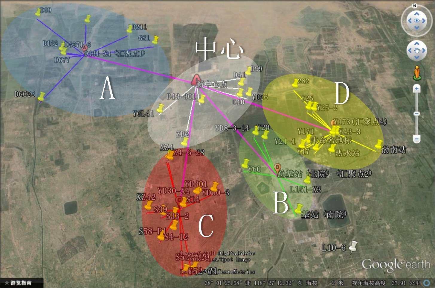 本次方案將整體區域劃分為5大區域,油井監控70點位計算。將原有油區辦中心基站,網橋在部分點區域補點使用。另外每個區域采用3臺90度扇區無線網橋組合成360°廣角覆蓋。在每區域的鏈路匯聚至該區域匯聚點后傳至新中心點。區域內的每接入點采用智能基站設備傳輸至匯聚點,匯聚點至中心點采用千兆設備傳輸。具體如下如所示: