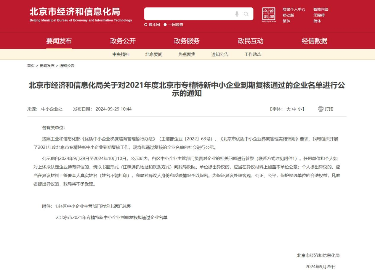 近日,北京市經濟和信息化局公示了專精特新復核通過企業名單,北京欣智恒科技股份有限公司(以下簡稱“欣智恒科技”)順利通過復核。