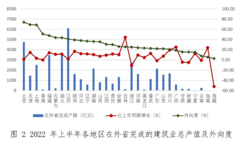 廣西、海南的增幅也超過了20%。7個地區在外省完成的建筑業總產值出現負增長,其中西藏的負增長超過50%,浙江的負增長超過10%。從外向度(即本地區在外省完成的產值占本地區建筑業總產值的比例)來看,排在前三位的地區是仍然北京、天津和上海,分別為74.0%、69.1%和68.3%。外向度超過30%的還有青海、福建、內蒙古、湖北、江蘇、陜西、河北、遼寧、湖南、山西、江西、貴州等 12 個地區(圖 2)。