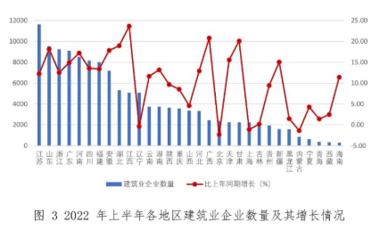 2022年上半年,全國建筑業企業數量超過5000家的地區共 11 個。其中,江蘇的企業數量最多,達到11626 家。山東、浙江、廣東的企業數量均超過9000家。與上年同期相比,27個地區的企業數量增加。