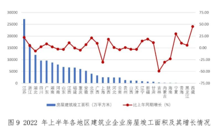 寧夏、江蘇、北京的增幅也都超過了20%。12個地區房屋建筑竣工面積出現負增長,其中吉林、上海、內蒙古的負增長均超過 30%(圖 9)。